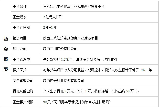 基金的计划出资额拟定为人民币2亿元,其中,基金投资人初始出资额不低于人民币5万元,陕西三川投资作为基金发起人之一,出资。最低投资金额为人民币100万元。基金发起人根据拟投资项目资源的储备情况和预期投资进度分期缴付到位后,负责向其他合格投资机构或者合格投资人募集,直至基金封闭期届满。其他投资人仅限于集团员工和三八妇乐直销会员。
