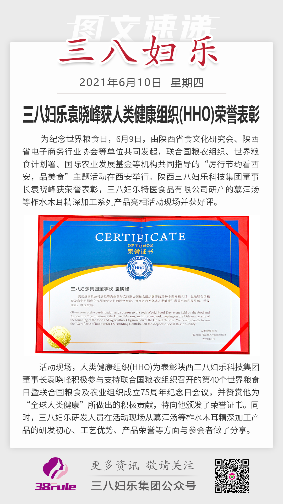 三八妇乐袁晓峰获人类健康组织(HHO)荣誉表彰