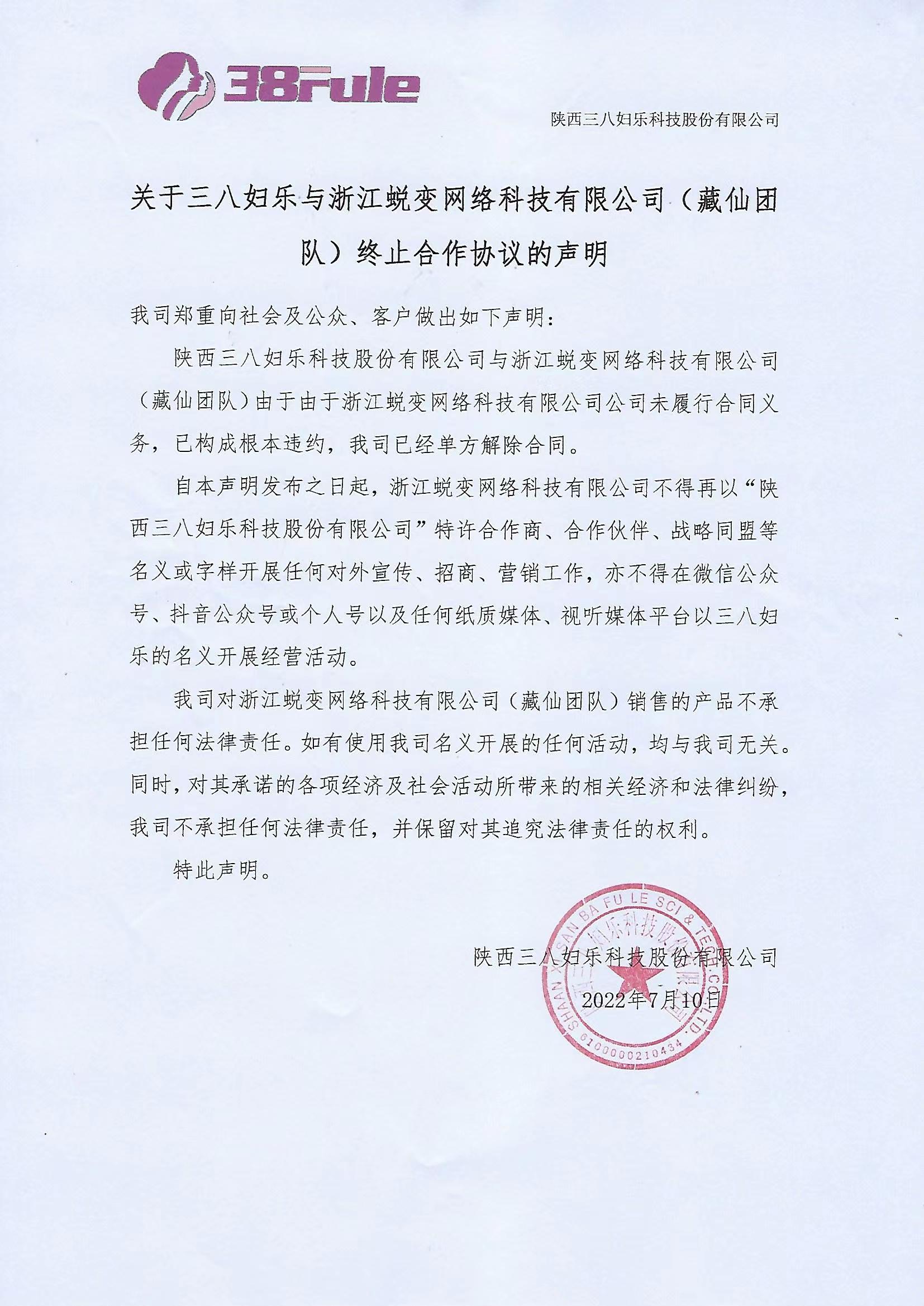 陕西三八妇乐科技股份有限公司郑重声明